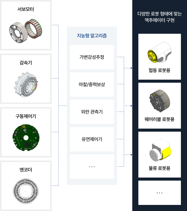 로봇의 동작 및 작업목적에 따라 액추에이터를 구성하는 감속기와 모터는 다양한 조합으로 구성이 가능 합니다.
